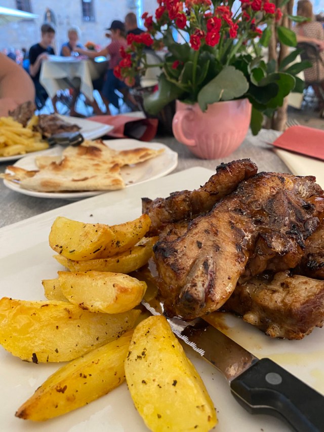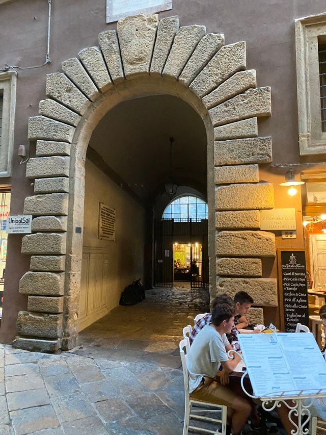 That evening we went to Ristorante Etruria for some grilled meats and fries. I remember Niamh’s (boar cutlets) being better than mine (ribs, which were tasty, but came with a lot of gristle – and hence were quite inexpensive – I should have realised). We were given by now what is the obligatory half-bottle of Chianti by the staff. We took a couple of snaps on our way home, including this arched entrance – which is the way into our apartment block.