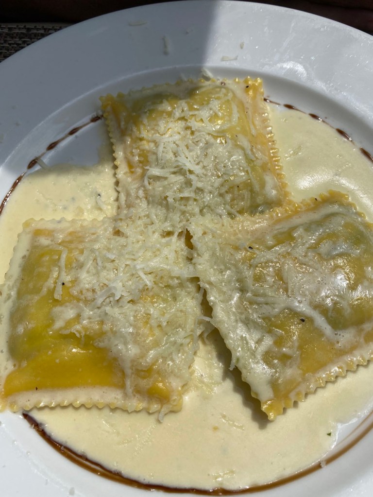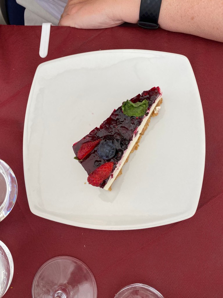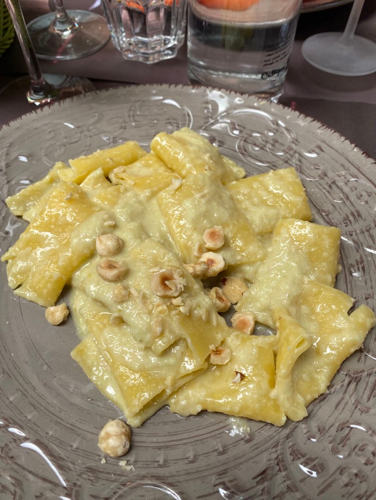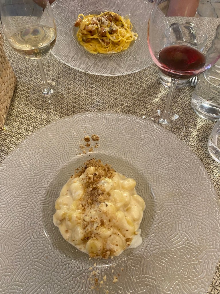 We pigged out a bit that day, firstly going to our neighbours Porgi l’Altra Pancia for lunch. Unusually, we sat outside and were given a little surprise of some Prosecco on the house. Niamh had her beloved Caprese salad, and I had a vegetarian dish – paccheri with a hazelnut-based sauce. Very tasty. We had cheesecake and tiramisu for dessert.