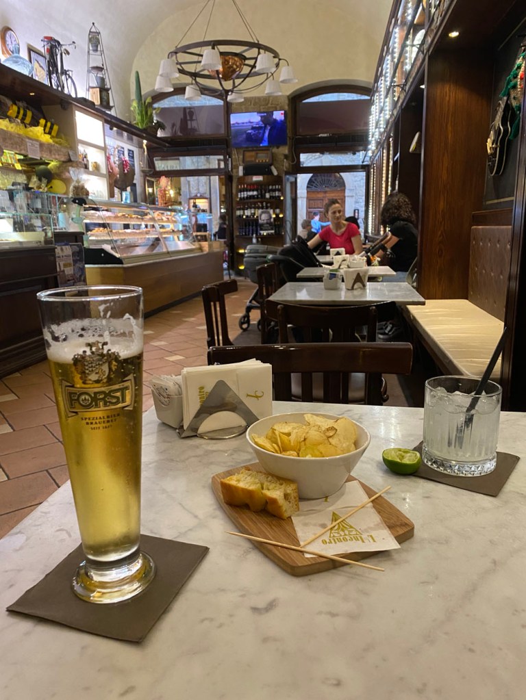 For dinner, we went to La Vecchia Lira. I had chickpea soup to start – not sure what Niamh had – I can’t recognise it from the photo. For primi, I had my new favourite – the tortelli stuffed with shredded lamb in a savory apple sauce, and Niamh had the pici cacio e pepe – they do it very well here. Delicious. A tirimasu might have been had. I’m sure it didn’t last long!
