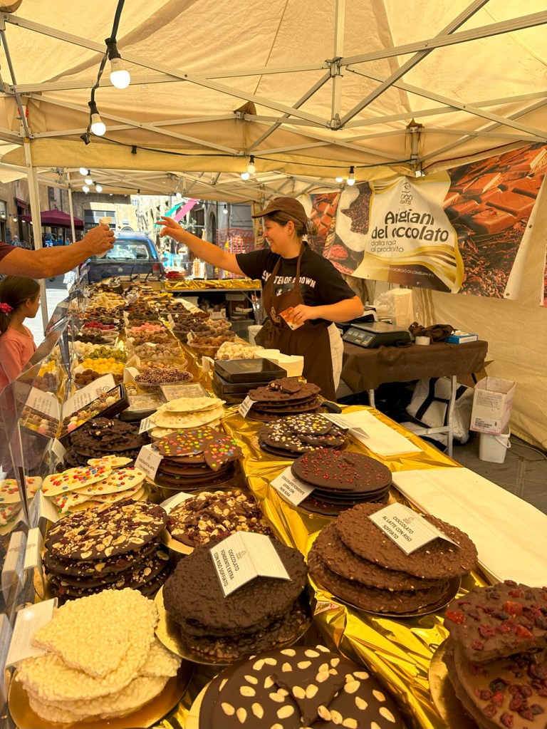On the way that day, we noted that the chocolate fair was on. When I say ‘noted’, I of course mean that we slavered over the stalls and bought several kilos. It ain’t cheap, but it was worth it… except perhaps for one of the most celebrated chocolates in Italy: PGI Cioccolato di Modica. This particular type of chocolate was sold in bars of varying natural flavours. Now, how to explain my issues with it… One of the most important things for food, for me, is mouth-feel – texture and consistency, if you will. Well, I will absolutely agree that the flavours of Modica Chocolate are spot-on – but I would also have to say that the consistency is awful. It seems to me that it’s made of chocolate paste with little fat, and which is subsequently stirred vigorously with granulated sugar. The substance you end up eating is both chalky and gritty – I can’t handle that. Chocolate for me must be smooth and buttery, and melt in the mouth. Anyway – do try it for yourself if you ever come across bars of it and let me know what you think!