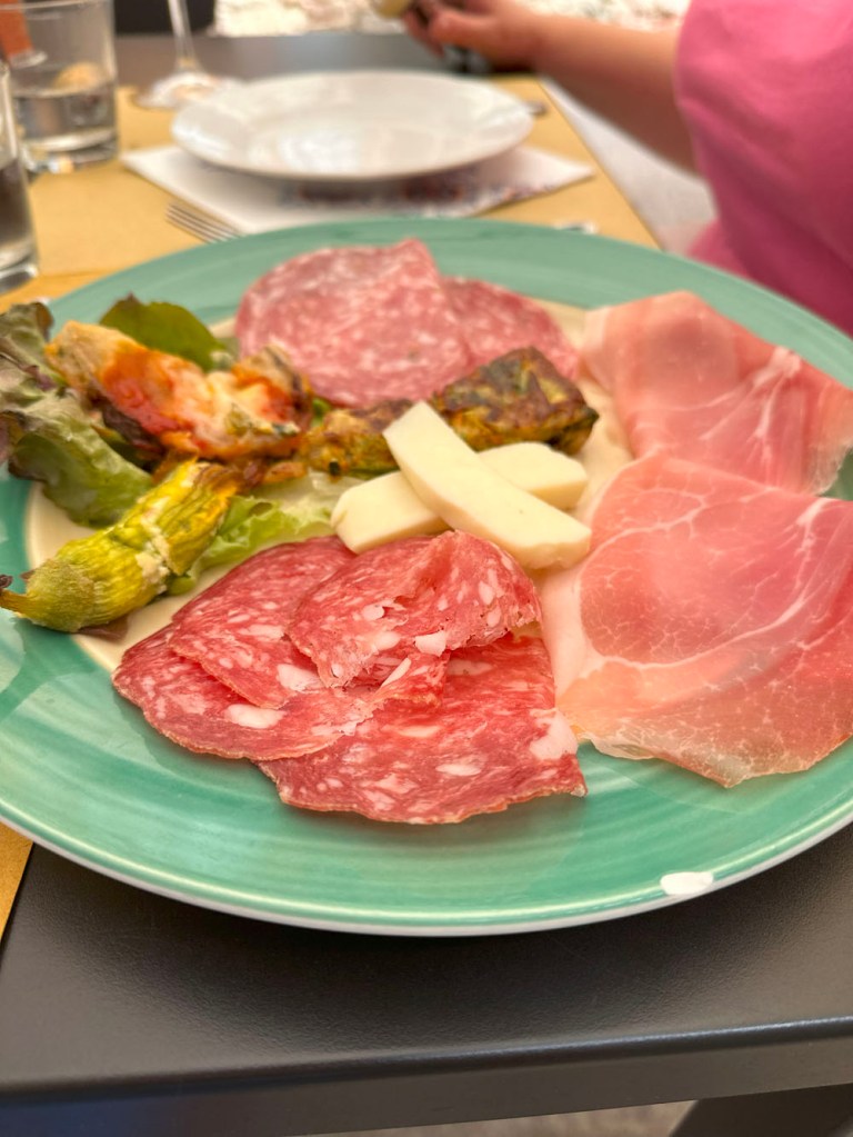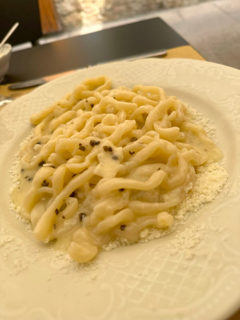 We were getting peckish, and silently prayed for the restaurant (Ristorante Carato) to be open, and indeed it was! We sat outside and had some wonderful deep-fried zucchini flowers and really amazing pasta dishes. The roadway was narrow, but still used by traffic, and Niamh and I marvelled at one point when a large 4×4 reversed all the way up the street, passing by our table, leaving seemingly centimeters on either side. Occasionally, the owner/chef came out to talk to locals who were relaxing at a table a little aways from us. It was just a fine way to spend an afternoon, and I would really recommend the restaurant if you are in the area.