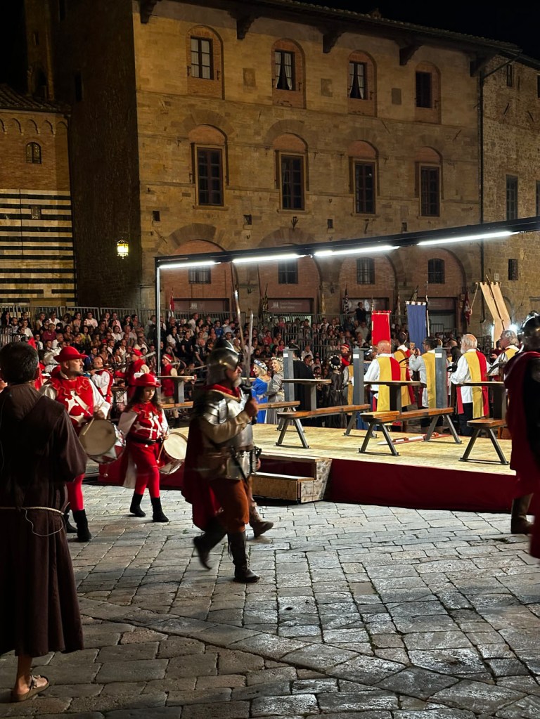 There was a crossbow competition in the main square that night, but the pomp and circumstance began in the same square as the restaurant, so we got both dinner and a show!