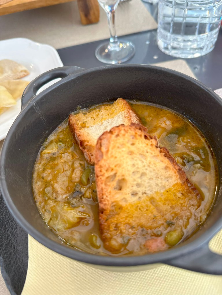 We had arrived too early (my fault) and so had a little walk about the old town with our friend – only as far as the bridge, though – then it was time to enter the restaurant. We were shown to our table by the very friendly staff. We saw there was a burgeoning terrace outside, with a fab-looking view: