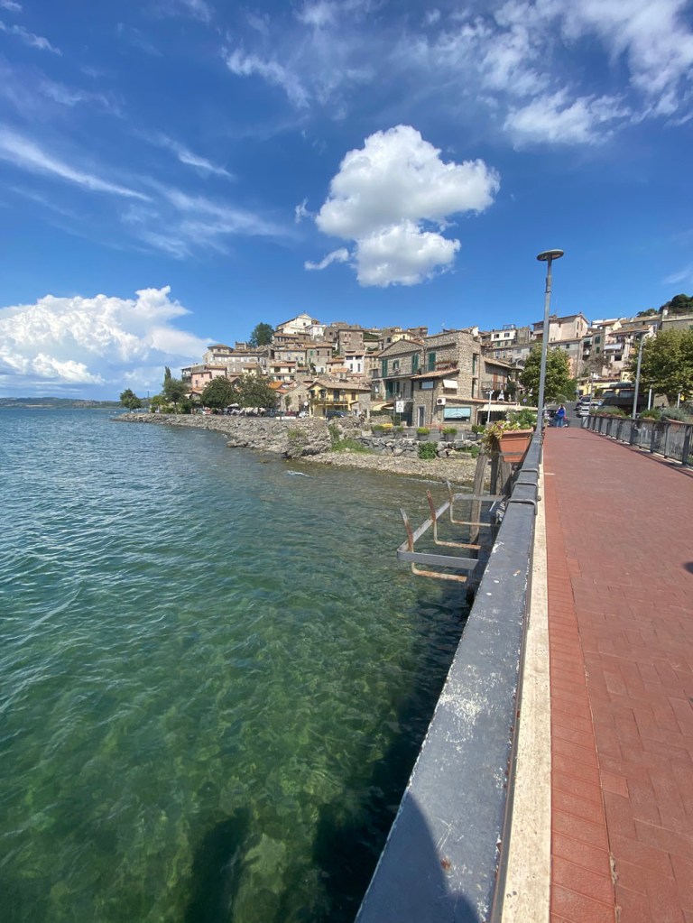 Off we went towards the ringroad around Rome, and then, quite quickly, we seemed to be doubling back before we felt he’d left the airport. And then back again. We re-checked Google and re-input the route, but it seemed to be right. We hit a roundabout that we’d hit before and took a different exit. Very odd. Anyway, we were off and in 3-lane traffic around Rome. Well, they certainly drive a little more aggressively here, don’t they! We were only on the ring road about 30 minutes, before we were back on more the more civilised 2-way roads. About 20 minutes later we entered the lovely lakeside town of Anguillara Sabazia. We very luckily got parking right by the lakeside restaurants, and had a little explore.