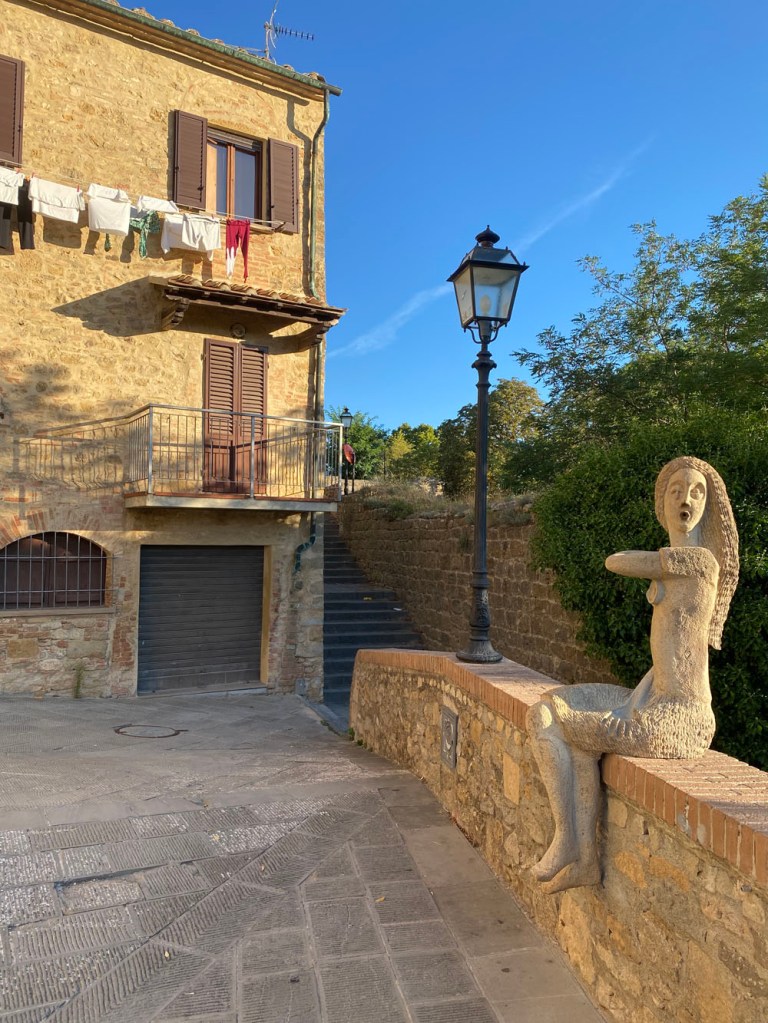 So, we decided to head out of town and make for a village in Volterra’s comune we’d never been to before: Villamagna. From there, we’d go to Legoli via a curiosity in the countryside: Triangolo Verde. I may have mentioned before, but the comune of Peccioli has made itself relatively weathly by creating a facility which handles much of Tuscany’s non-recyclable waste, and from that to energy production. The villiage itself is an outdoor art museum, and there are some curiosities in the area, not least of which are the ‘Peccioli Giants’, which represent the power of Peccioli coming from the earth. There is one squatting (a man, quite naked and anatomically accurate) over a building a little way outside the main part of town, and another visible from a modern terrace on one side of the old town, and there are a couple more in Trinagolo Verde. Now, I wasn’t too sure what this place was, other than the home of a couple of these giants – but we’d find out. But first, the drive!