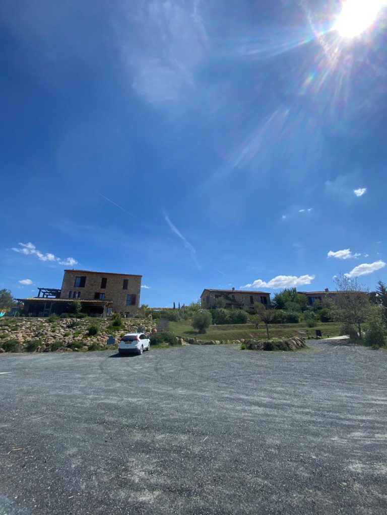 We found ourselves a little way outside Legoli at a closed automatic gate – the gate to Triangolo Verde. In front of a gate a huge shaggy dog lay in the sun. When our car approached, it slowly got up and ambled away, just outside of reach. I got out, and buzzed the intercom at the gate. I explained in broken Italian, and then broken English that we would like to come inside if it was open. The nice man inside the intercom said yes, and after registering us (names, addresses) pressed something to make the gate slide open. I raced back to the car, and we followed a curving path downwards towards a building, past an open air circular theatre and a place where we could park.