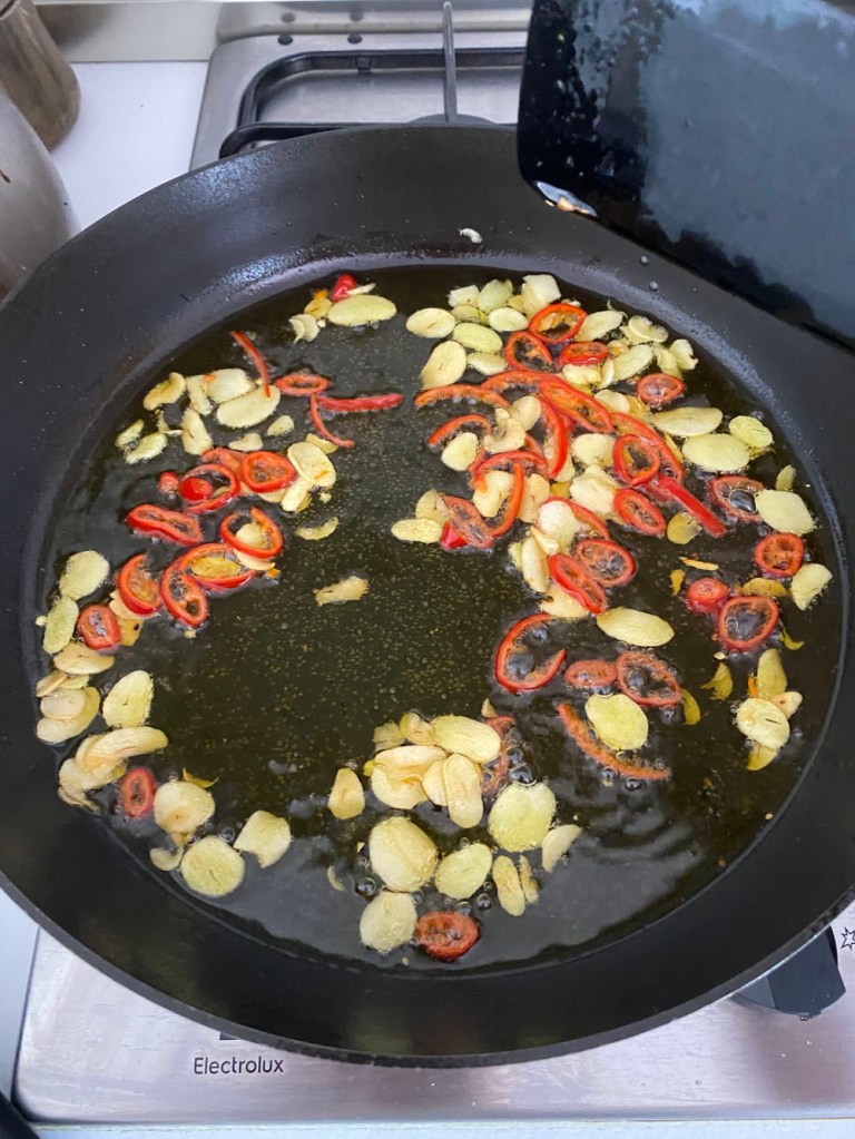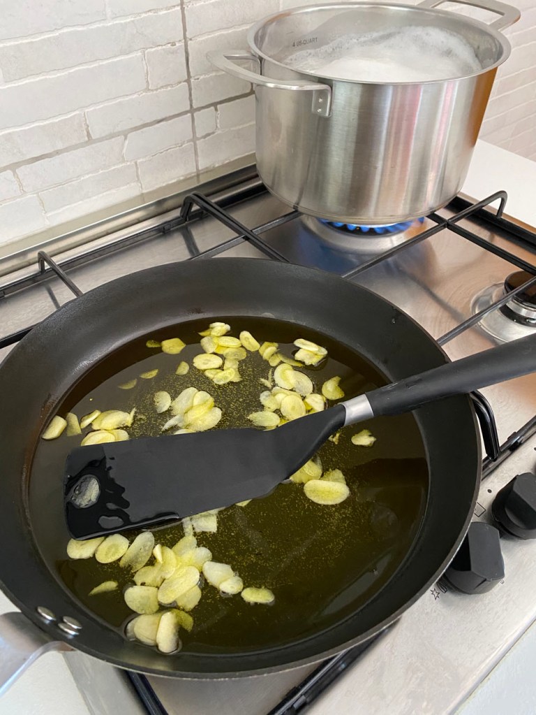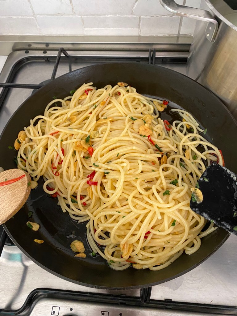 Lunch! And this time, believe it or not, it was my turn to cook. So, I made the simplest pasta I possibly could: spaghetti all’aglio, olio e peperoncino.