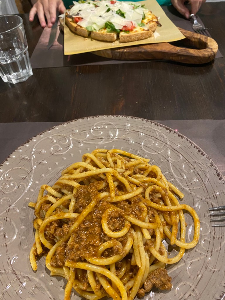 Their version of Zuppa alla VolterranaThe colour of those tomatoes!Homemade pici with a white ragu… tasty and fillingNiamh had the strozzapreti pasta (it means ‘priest-strangler’) with the wild boar. I had food jealousy, even though mine was also great.
