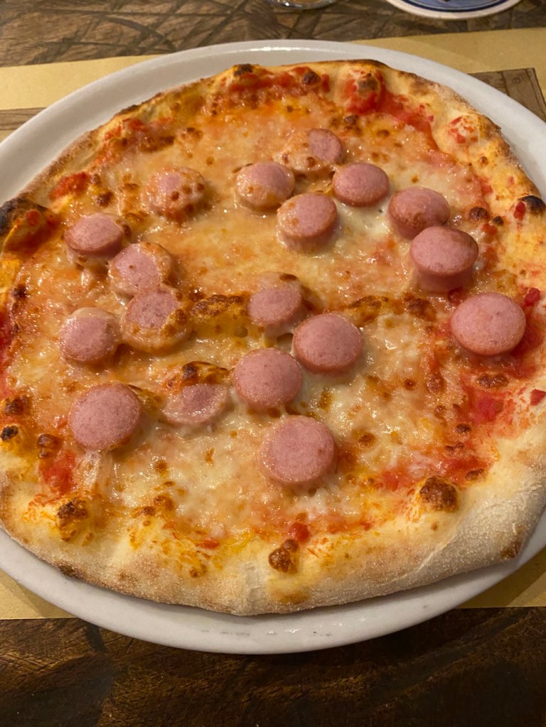 We rested back at the apartment, and when hungry again headed out to La Mangiatoia. I love the pizza at Pizzeria l’Ombra della Sera, but it just isn’t as lively as La Mangiatoia. To be honest, I don’t think I could have put a pizza away after the lunch I had. And you can’t share pizza in Italy. It’s a mortal sin. Although in La Mangiatoia, they actually make massive, family-sized pizzas, with multiple sections similar to a Quattro Stagioni (the family at the table next to ours was chomping on one). Anyway, I wasn’t up for it. Niamh was, but I had a burger instead. For those reading in Ireland, the burger here is the closest you can get to a chipper-style burger in terms of taste, if you fancy that!