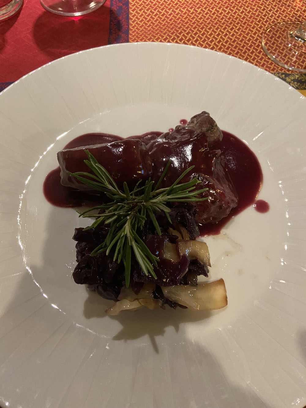 Then we had the pasta course. People who aren’t familiar with Italian cuisine, please take note. That’s one pasta course, out of nine courses. And not a pizza in sight. See? It’s not just a carb-fest in Italy! It was agnolotti (a filled pasta), stuffed with cinta senese, with a sauce of mostly chicory. Now I’m not a fan of chicory – I find it bitter, but don’t mind a little bit of it. If the stuffing and sauce had been swapped, I would have been a bigger fan. Having said that I know the others liked it, so it was a matter of personal preference. What I *will* say is that the pasta was, of course, cooked to perfection.