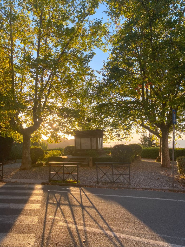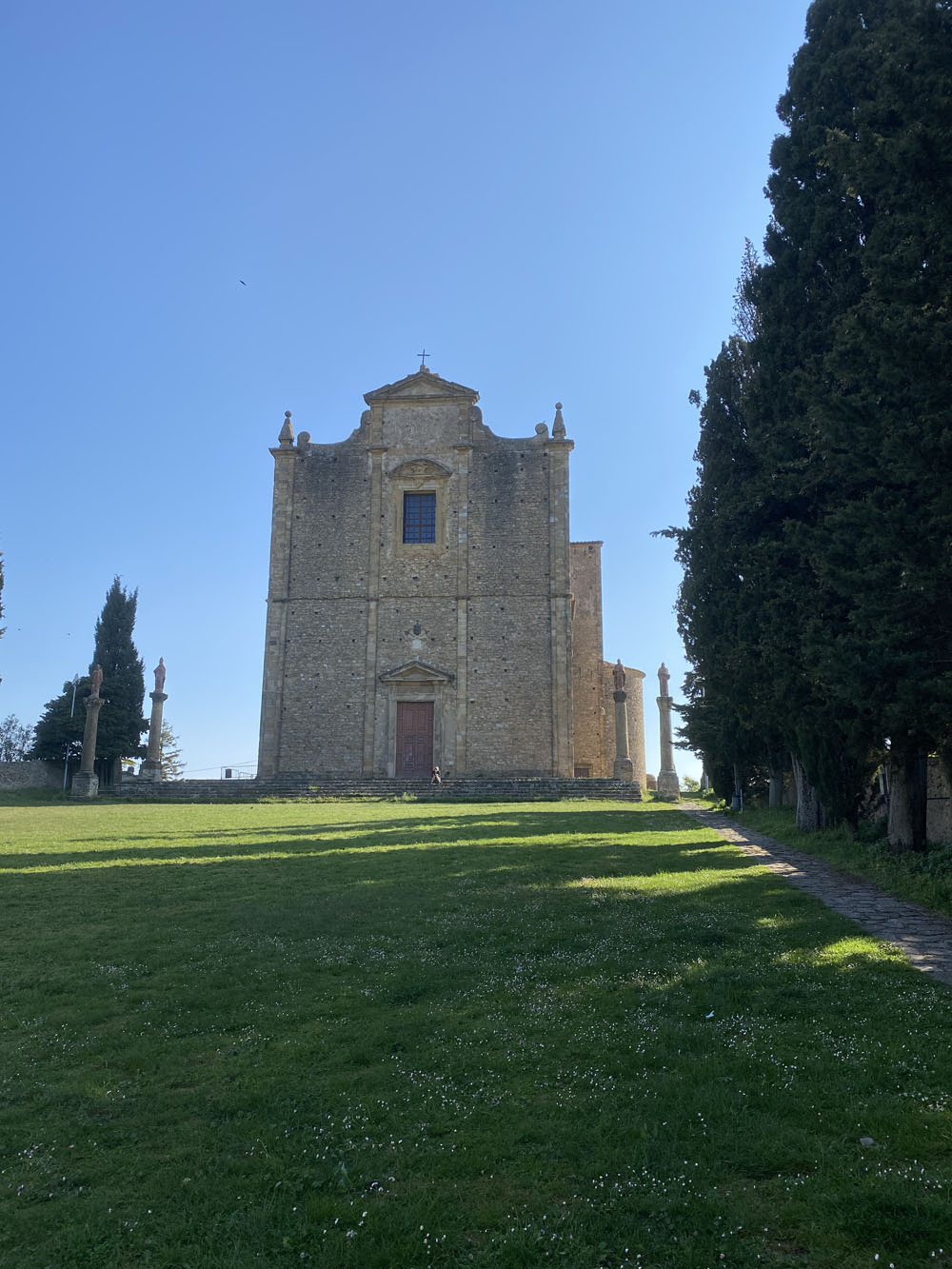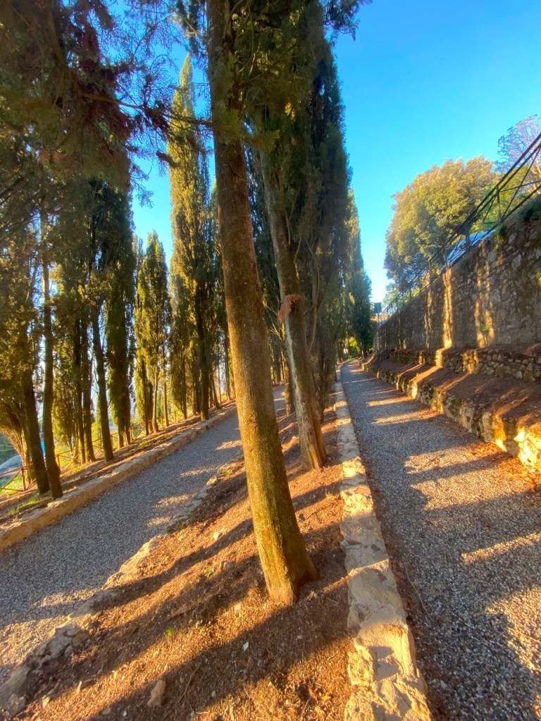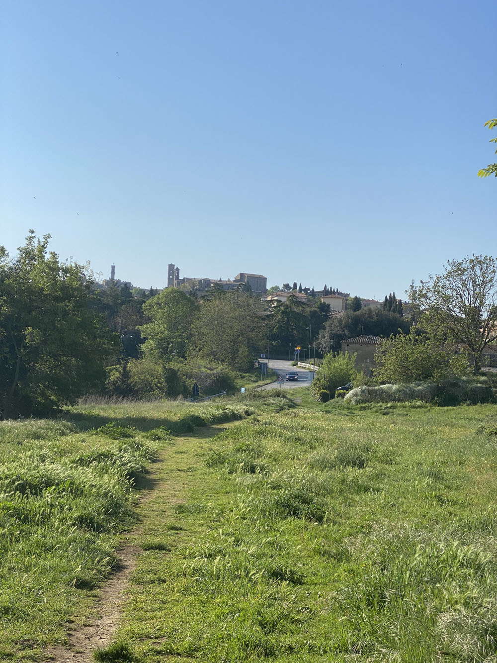 The church’s grounds run parallel to the SP15, along which some old Etruscan wall also runs. I walked along a bit of a greenway I hadn’t explored before – some lady was walking her dog, and there were narrow trails created by previous walkers there. I got an impressive shot of the surrounding countryside there, slightly spoiled by the sun being in the wrong place.