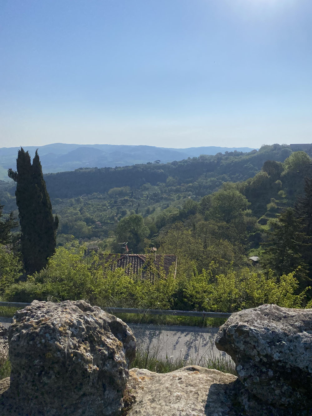 A shot of the townThe countryside through the Etruscan stonesA closeup of the nearby valley and outlying colline