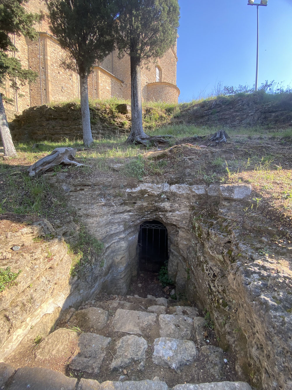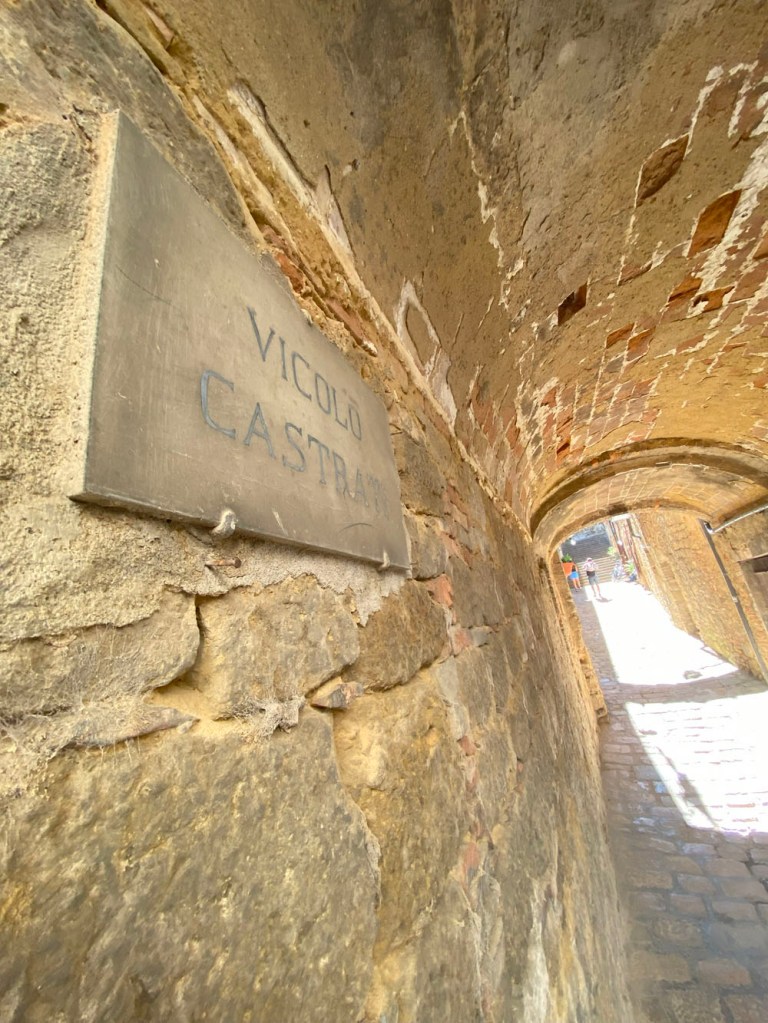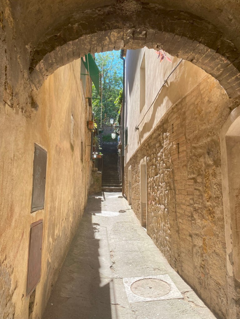 Between the church and Pizzale XXV Aprile, there are a couple of things: firstly, a few underground Etruscan mini-crypts, and secondly an open space where soccer practice or celebrations can take place. It was May 1st the previous day, so the town was out celebrating on it. May 1st is a big deal in many parts of Italy, and in Volterra they celebrate it with Trippa alla Volterrana: a tripe dish cooked in a tomato-based sauce – always accompanied by red wine. The former is not my bag, the latter certainly is. Anyway, there were signs of partying in this area, and the food and drink stalls were still there. I didn’t take photos of that, because a tidy-up job was sorely needed. Instead, I took a photo of some street art celebrating the alabaster workers of the city.