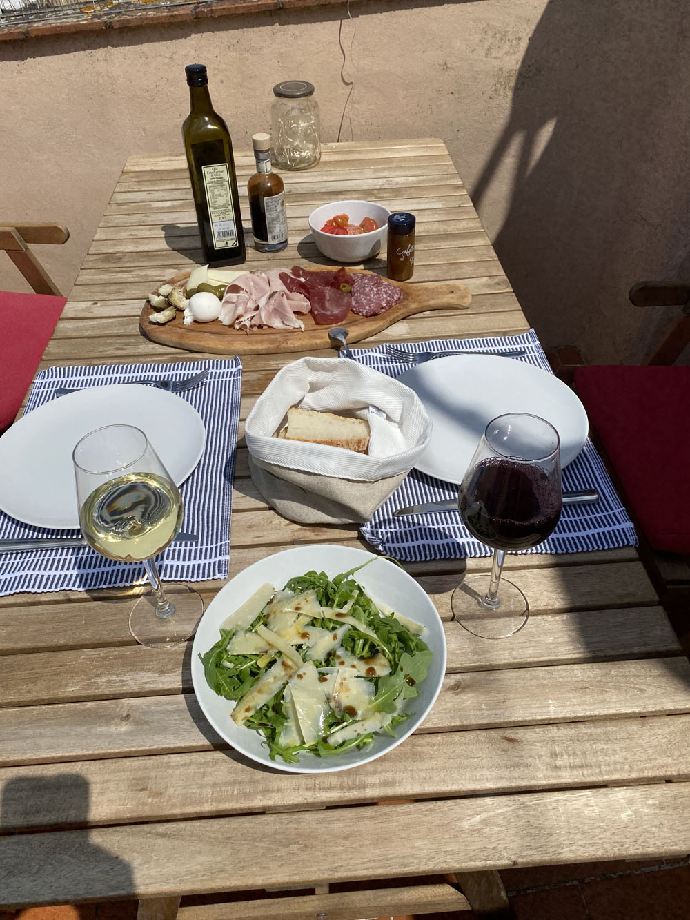 Once done, we celebrated by going to the Coop to do some shopping (we sure know how to celebrate), and grabbed some antipasti for lunch. Everything tastes better over here, most probably because everything *is* better over here. The Italians selfishly (and cleverly) hold on to their best ingredients. We had salumi, cheeses and rocket. All fab. We then settled down for some vegetating in front of various screens!