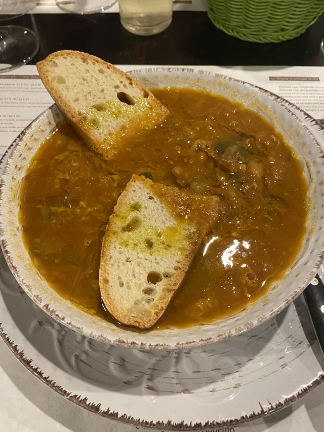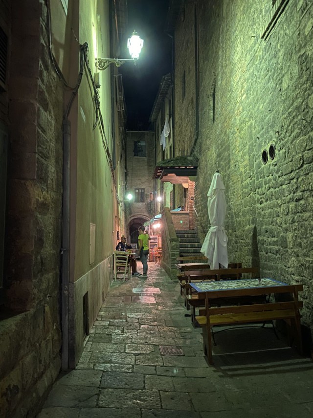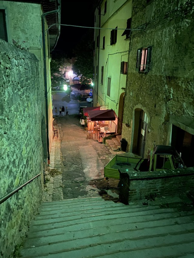 Later that evening, we continued to eat like teenagers, and fried up store-bought burgers and had some of Niamh’s patented rosemary fries. They were really excellent, but today I am in need of some veggies. I then went out for a brief walk, to see if I could locate a live band I could hear – they were playing some Dad-rock classics and didn’t sound too bad. I’m pretty sure they were in Albergo Etruria, just across the road from us. There seemed to be a cover-charge in, and I just wanted to mooch for a while. I skipped it and went back home.