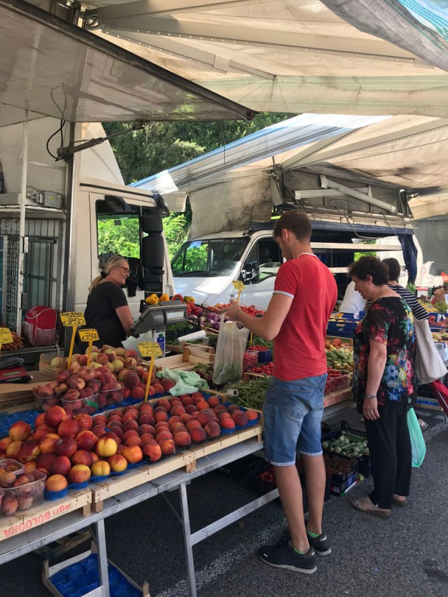 You might remember in the last blog, that samples are the way to go when operating a stall, and the lady working the fruit and veg one below very much subscribed to that school of thinking.