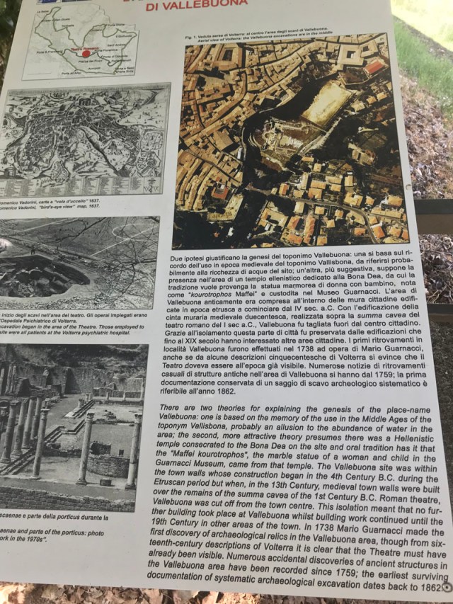 We have stayed in Volterra 6 times, for a total of about 9 weeks, and yet we still hadn’t visited the Roman or Etruscan ruins, so we decided to remedy that finally yesterday. I think it’s just €5 in per person (our visitor bought a Volterra Card, so she could check out most of the town’s main cultural attractions over 3 days) – which gets you into both the Roman site, and the Etruscan site in the public park.