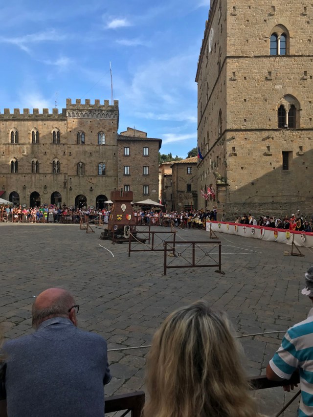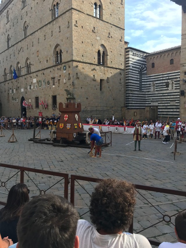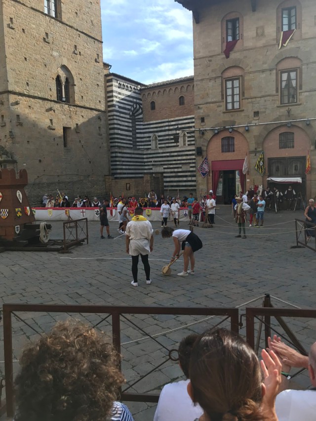 As it happens, it was for racing cheese-wheels (well, wooden versions) around a simple course in the square.  It was professionals versus volunteers, and was a bit of fun.  They have their own ‘palio’ involving these cheese-wheels they race down an obstacle course in October (the ‘Palio dei Caci’).  Sadly, we will be missing that.  So, this was a good alternative!