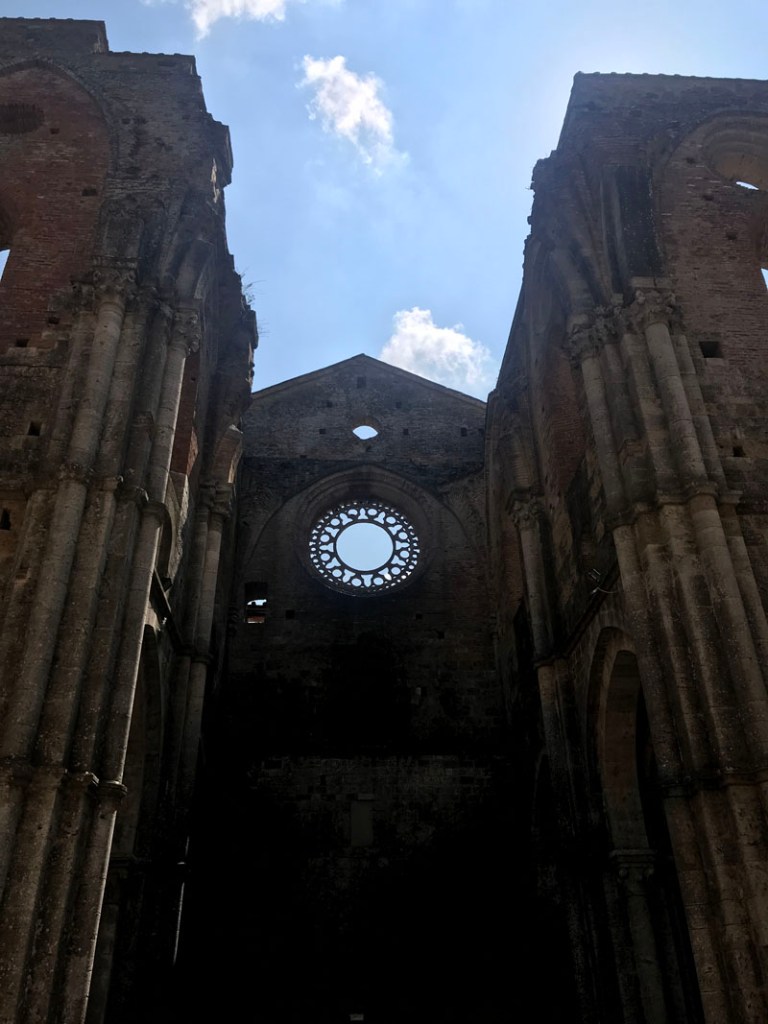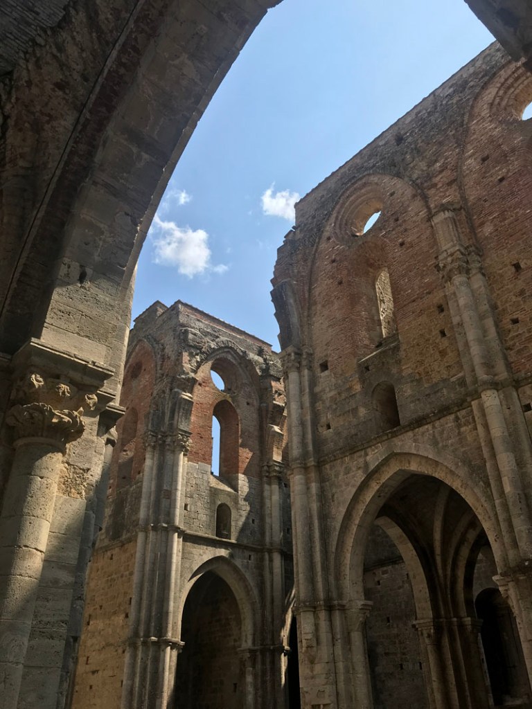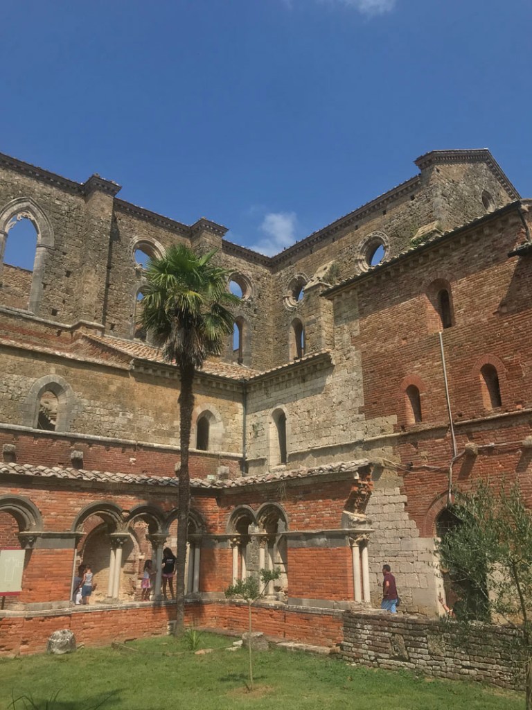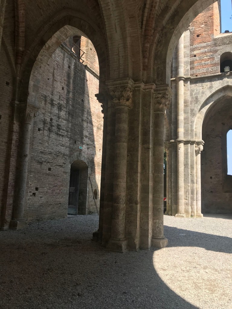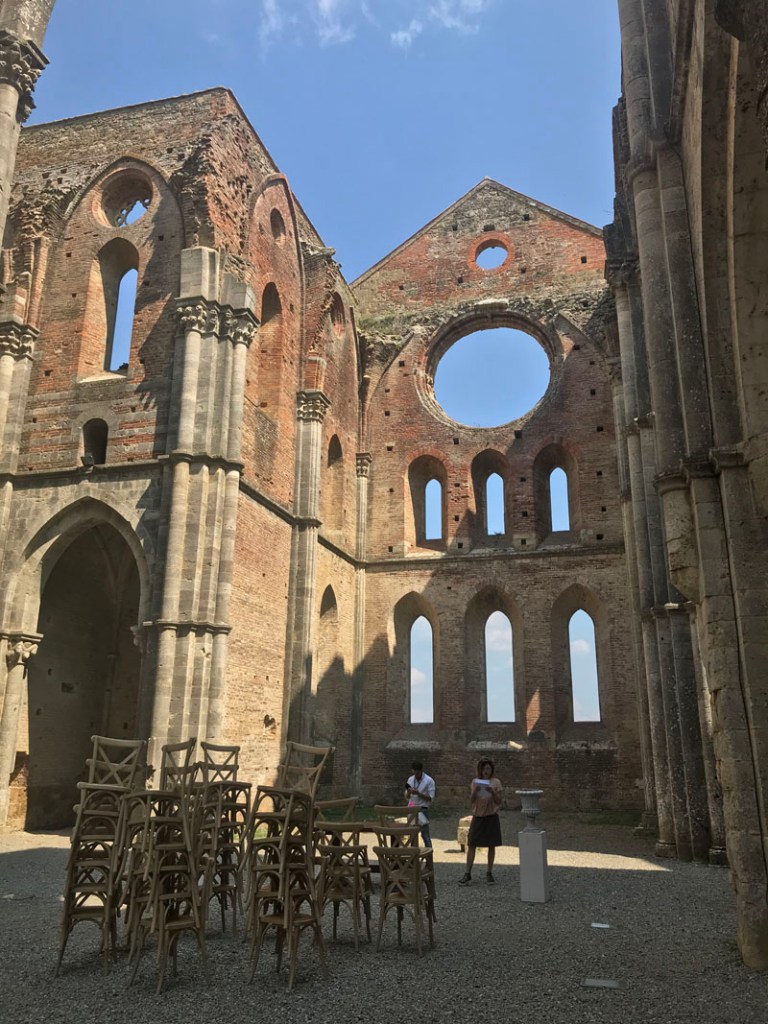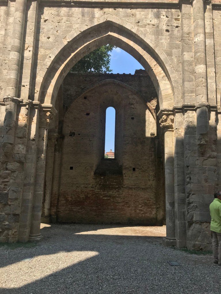 You might be able to catch the town of Chiusdino in the background of the pic above.  In addition to the rotunda, you have the ruins of the old Cistercian abbey of San Galgano, along with a couple of places to eat.  We both had pici with different sauces (Niamh’s was nicer), and explored the abbey (€4 per person).  We got there just in time, as guests began to arrive for the wedding of an English couple as we were leaving.  Hey, the ruins are nice, but they’re no Holy Cross Abbey.