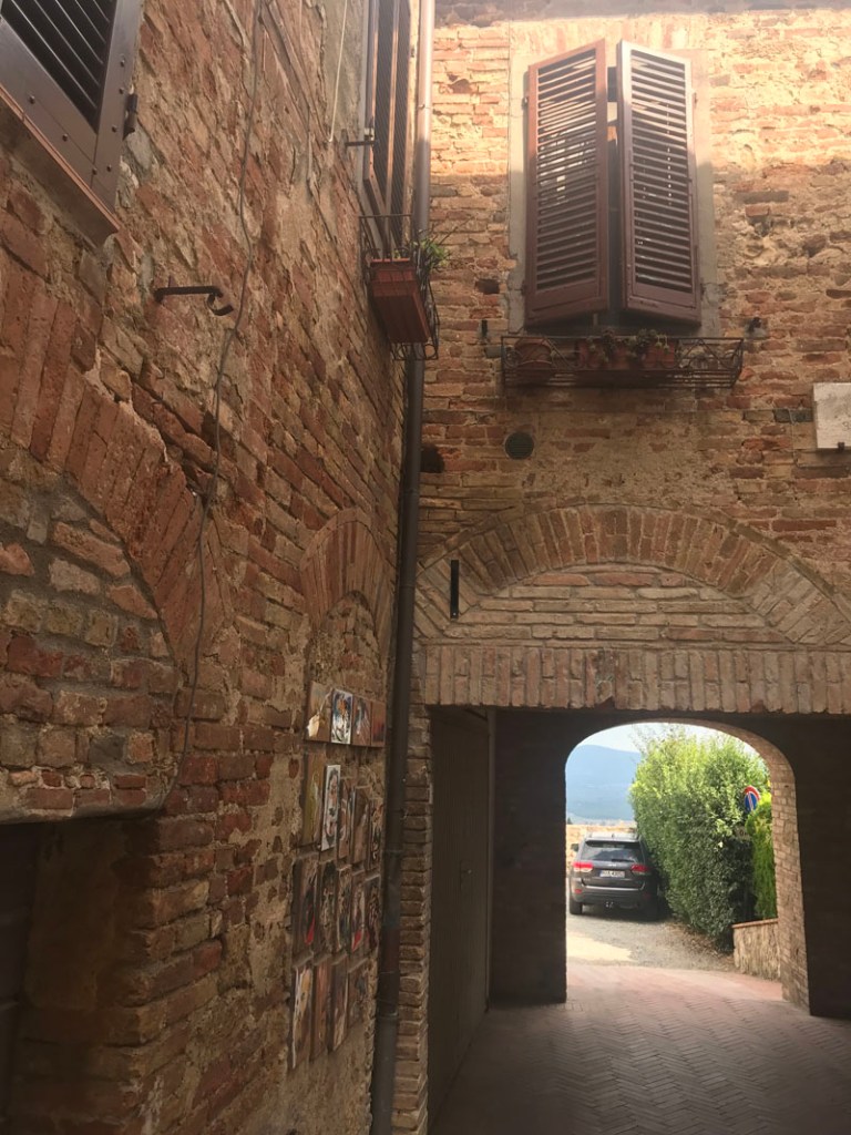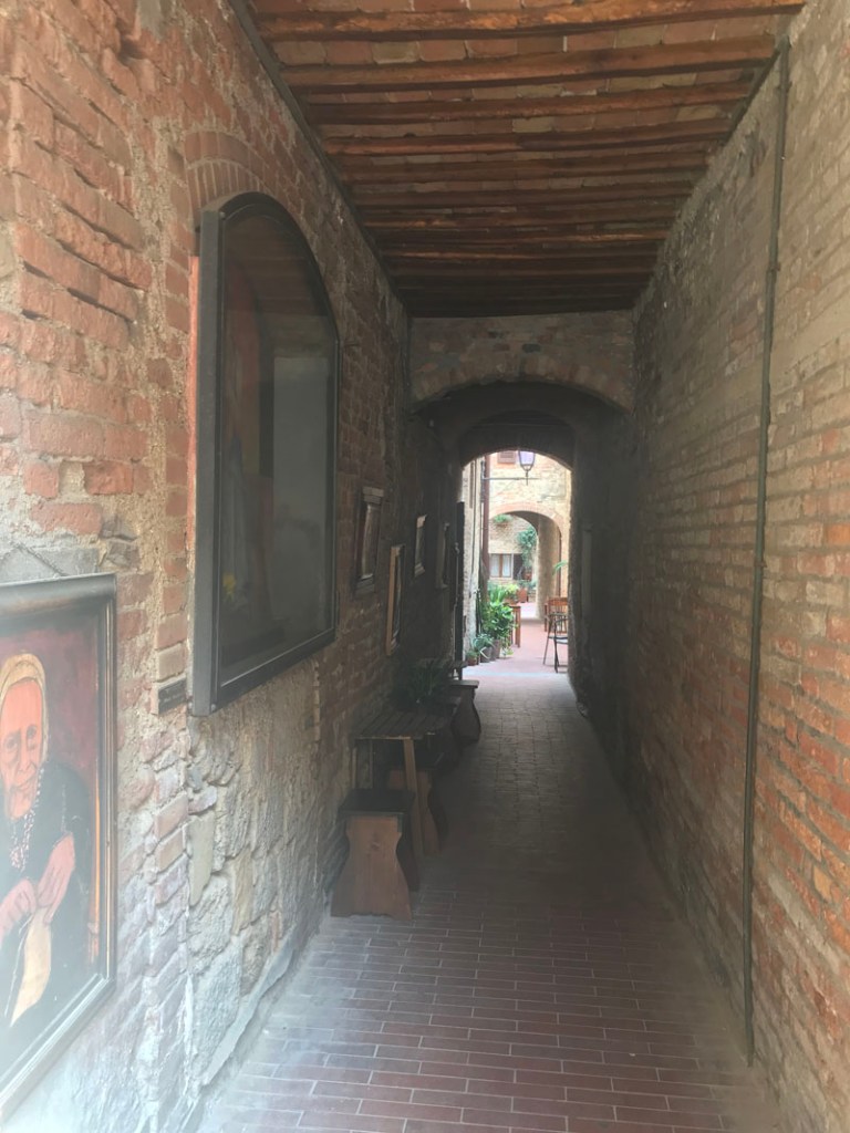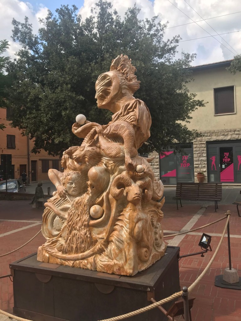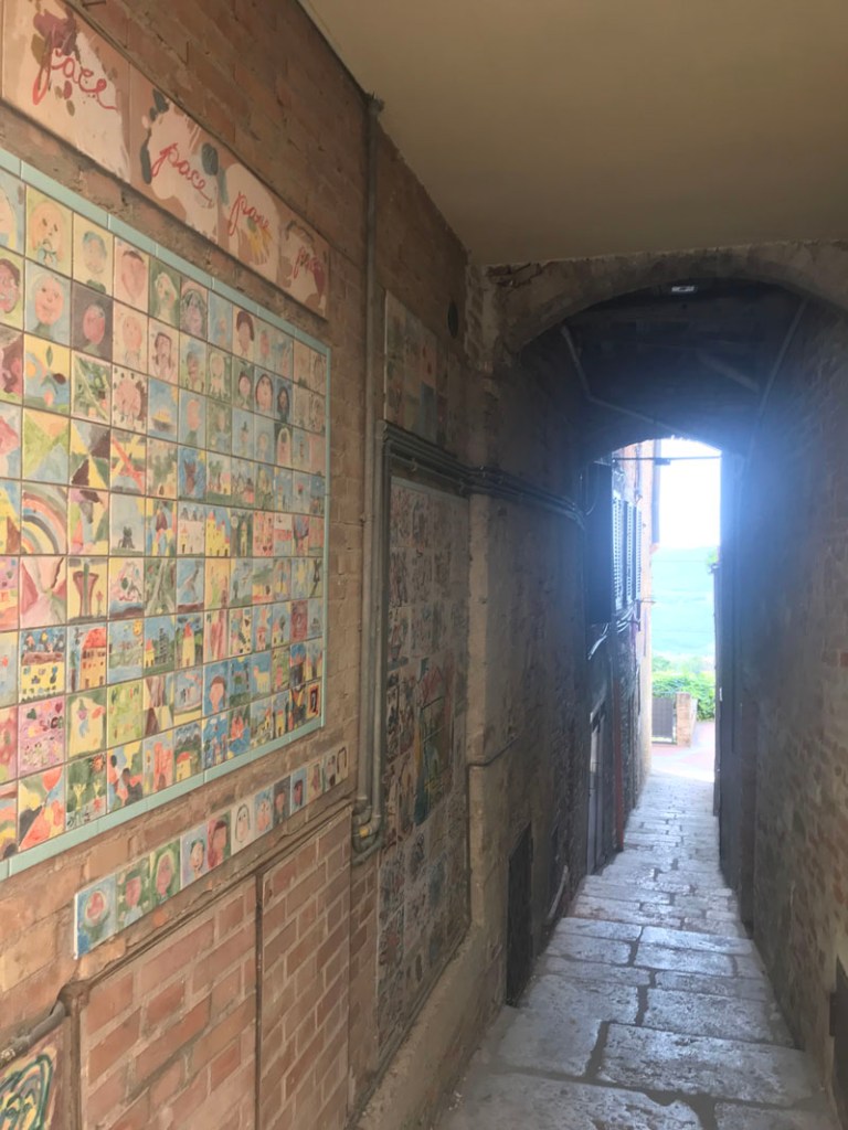 Casole d’Elsa is a fab little place, which can be reached from Volterra in about 30-35 minutes, along some very snake-like roads.  Unlike Volterra, it does favour those with physical disability, in that you can reach the upper old town by using the lifts available.  At the top is a sequence of (more or less) 3 parallel streets, literally lined with artwork.  As well as sculpture being everywhere, ceramics are painted by local artists (children seem to be encouraged too), and displayed outside on the walls of houses.  It just makes the town all the prettier for it, and it’s always a nice little visit – we must eat there sometime (gelato doesn’t count!).