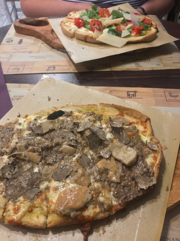 We both ordered different types of bruschette, and then a pasta.  We really shouldn’t have ordered the second course, as the bruschette portions were big enough, and we had to leave about a third of the pasta – which were also big – their restaurant name is fully justified!  That aside, while I know Niamh liked her bruschetta, mine was one of the best things I’ve had in Volterra so far – strictly for fungus-lovers: a hot bruschetta, with porchini, fior di latte (cow mozzerella, as opposed to buffalo mozzerella), all done in a truffle cream sauce, topped with tuffle oil and truffle shaving.  It. Was. Amazing.  I’ll be back!