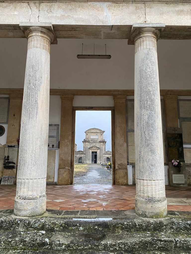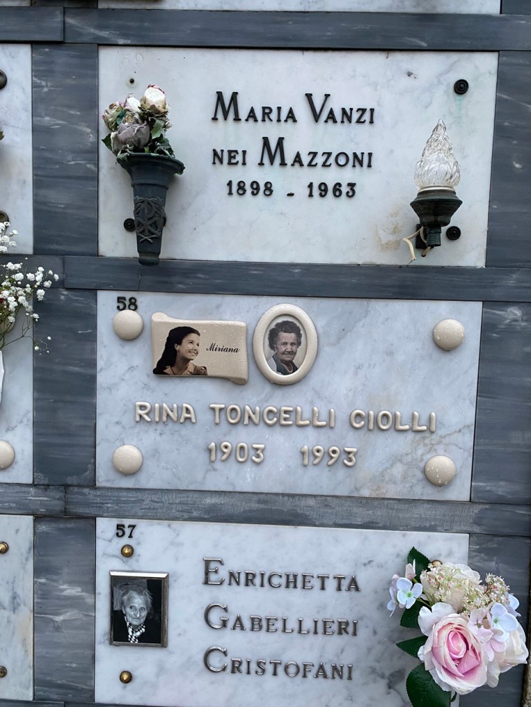 We moved from one massive courtyard to the other, by taking stairs down, taking glances at the photos every now and again. Some of them are smiling, some are dour – all are interesting. Niamh suddenly exclaimed “Wow – someone’s put one of the O’s on their grave!” After inquiring what she meant, she instead pointed towards the tomb in question. And it did indeed have one of Staccioli’s O’s on it – a mini-version. Then it struck me: this might be his grave – he is Volterran by birth after all!