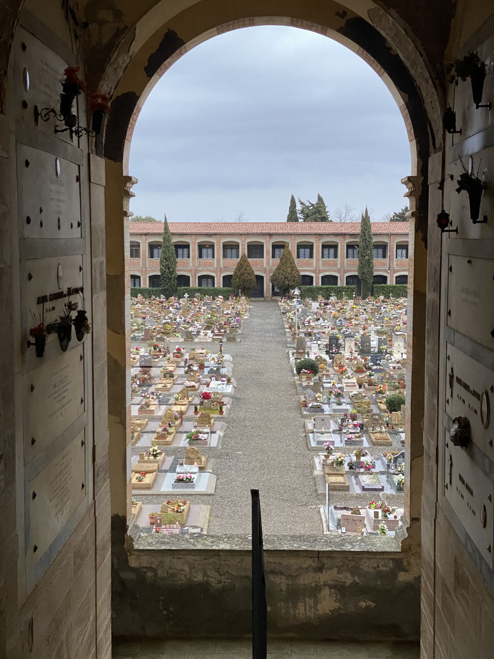 There’s really only so much time you can spend here when there’s no tour arranged. We ooh’d and ahh’d a bit before we crossed the road and into the cemetery. I don’t think our guest had seen an Italian cemetery before, so we explained (not that we are experts on the matter) that after a period of burial, the remains are removed to a ‘drawer’ in the walls. All of these slots are well-maintained and many have photos fixed to the front.