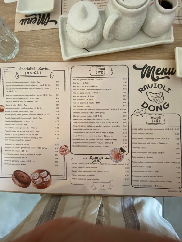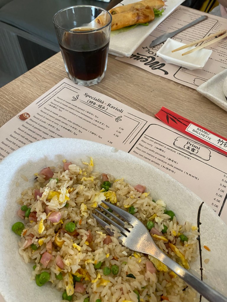 As we were in a large town, we decided to continue our quest for good Asian food, and found Ravioli Dong. We wanted something a little lighter, and steamed dumplings over in Italy are usually pretty good. It’s just their stir-fry dishes suck. We just went for some spring rolls, fried rice (or Cantonese rice, as it’s known over here) and a collection of mixed dumplings. For some reason, I didn’t take any pics of the dumplings, but at least you get the rice and the menu.