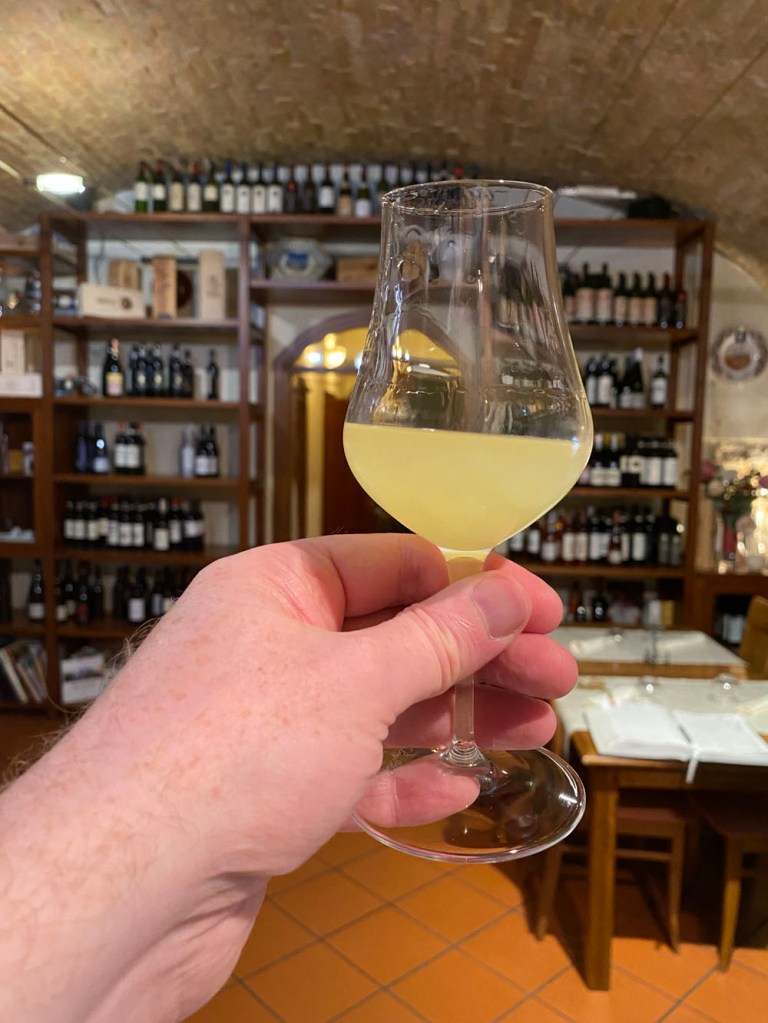 Rather than heading towards Volterra, though, we took an unfamiliar route towards Montaione. We had been in touch a virtual load with Tutto Torna Antique’s Emma. We arrived while she was closed for riposo, so we had a drink and nibbles in L’Antica Vineria Vanni. Nice place – I was complimented on my Italian, which always both mortifies and butters me up!