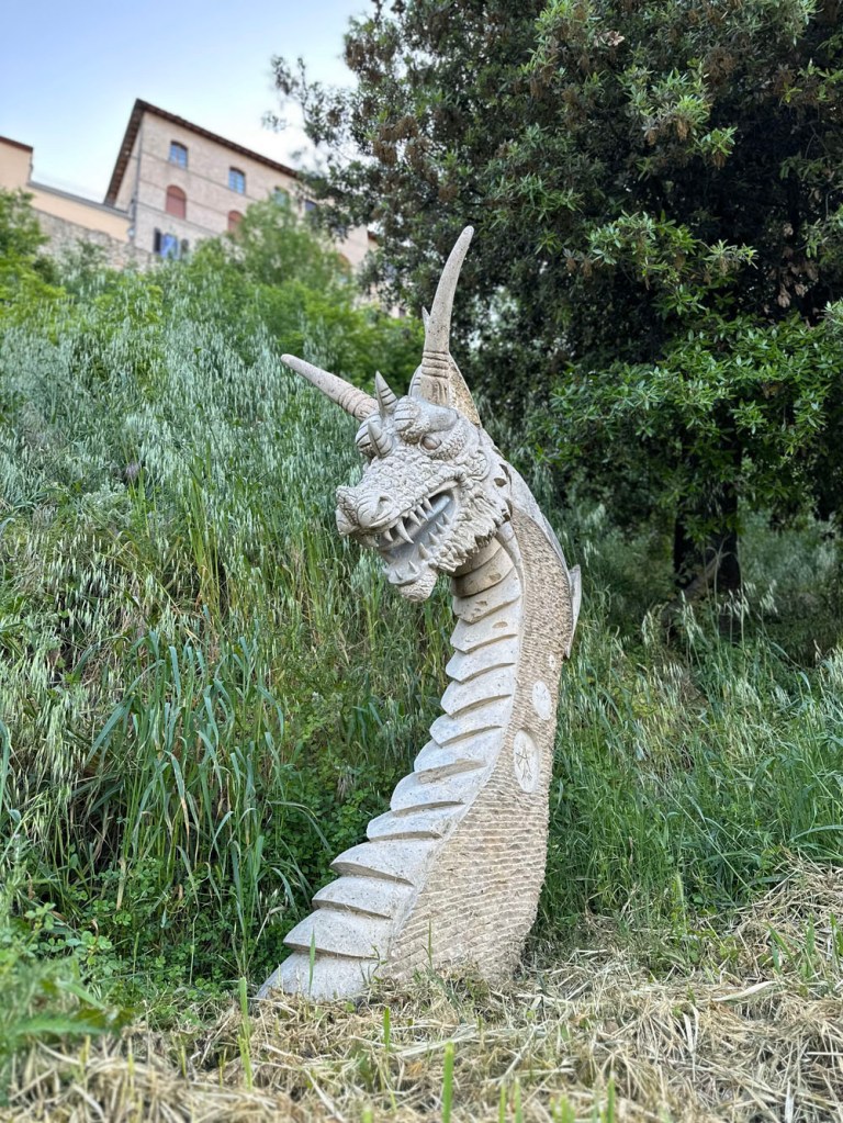 One of the first things Irish visitors say about Italian hilltowns, once they’ve gotten over the different aesthetics, is how clean the streets are. And we, even though we were used to hilltowns, all commented on how clean San Quirico’s streets were. They were immaculate. There were also large sculptures within the piazzette dotted around the town.