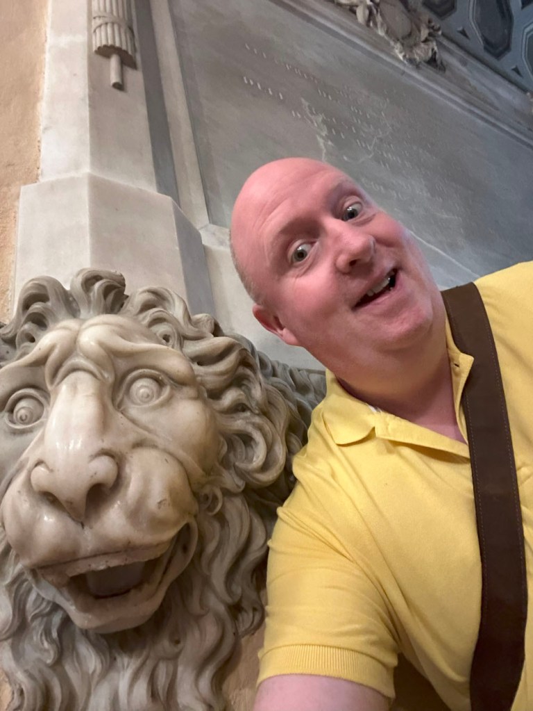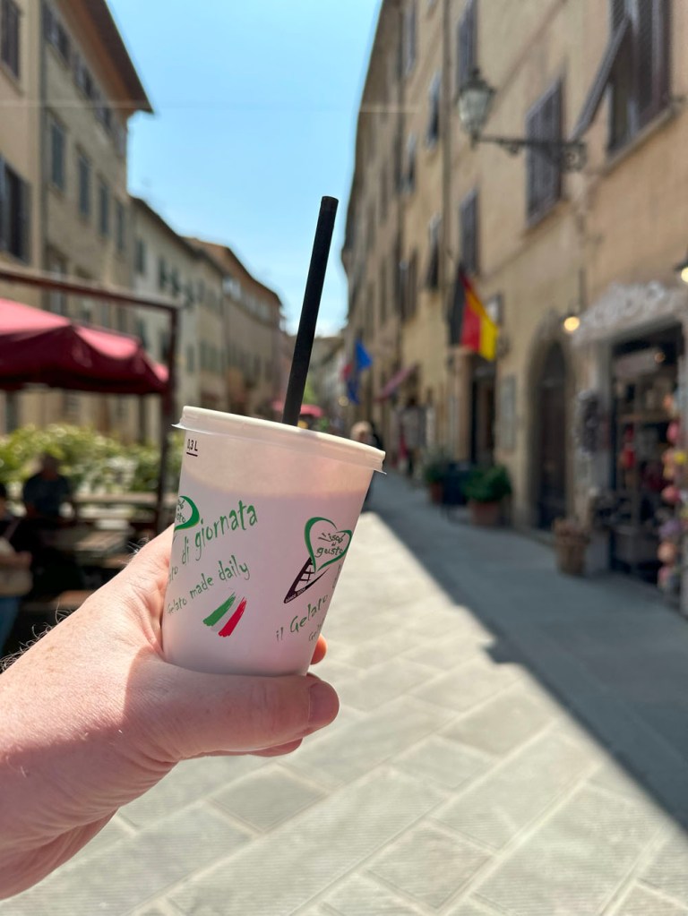 I had to laugh, as I was pointing my phone everywhere, when I got closer to the row of sculpted monkeys and saw that they too were not fully present, and were too on their phones, not paying sufficient attention to their surroundings. To my credit, I started filming and taking photos less. We stopped at a shop recommended to us by our friend – one of those general Tuscan crafts stores, but sadly it was closed. Protecting our heads, we stopped under an awning and pondered our next move. The bar!